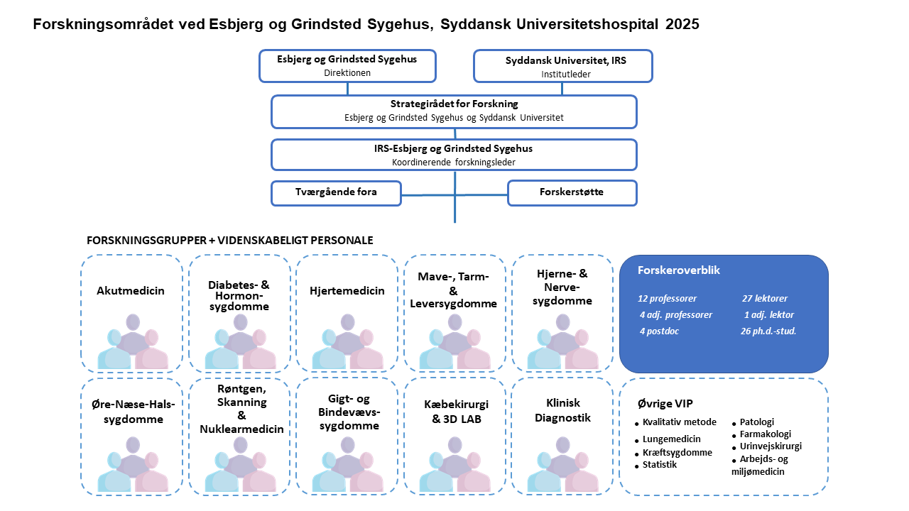 Forskningen på Esbjerg og Grindsted Sygehus er organiseret ved Institut for Regional Sundhedsforskning (IRS), Syddansk Universitet (SDU) med en koordinerende forskningsleder.